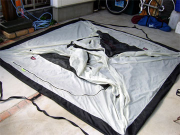 (1)設営場所を決めたら、その場所にテント本体を広げる。